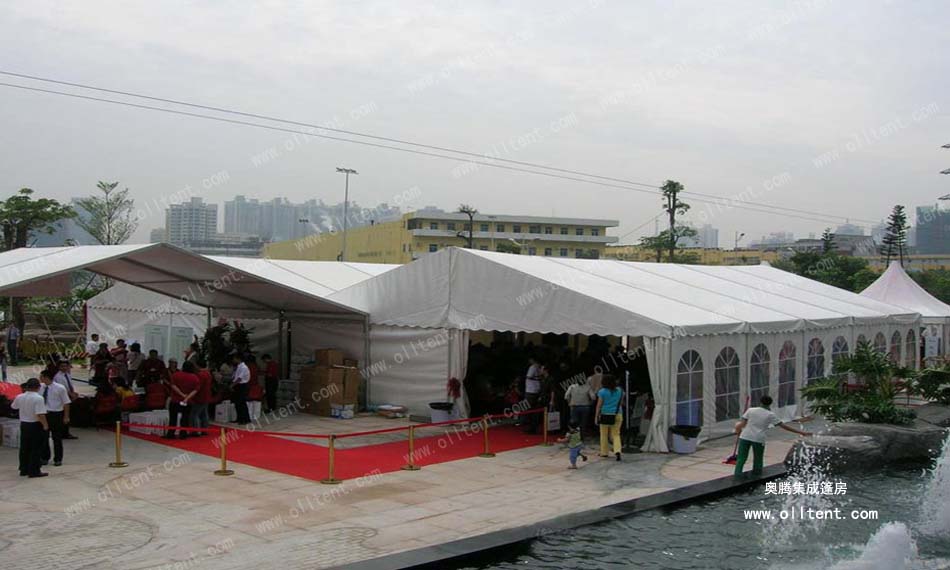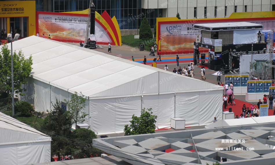 傳統的人字型篷房來作為會展篷房再適合不過了,該款篷房產品采用大型凈跨結構,內部無任何立柱,具有很大的內部空間利用率,無論是大型機械還是設備都可以輕松進出,內部可按自己想法隨意布置。篷房框架采用高強度鋁合金材料,安全穩固能抗8-10級大風;篷布采用雙層PVC刀刮篷布,防水防紫外線,阻燃B1級別,十分適合大型展銷會這樣人流量大的活動。