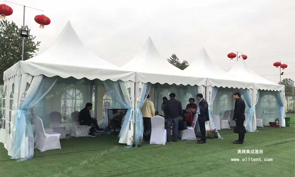 歐式尖頂篷房采用歐式風格,外形時尚美觀,有多種規格尺寸可供選擇,但是常見的尖頂篷房體積較小,難以滿足大型展銷會的需求,因此常被用來當做展會入口或接待處來使用。
