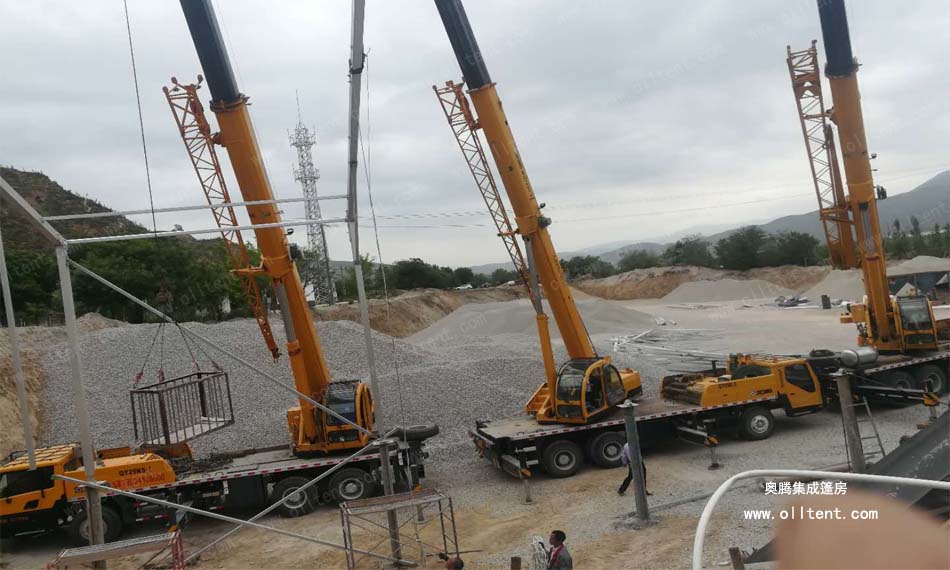 后來老板介紹道:“這是江蘇一家工廠研發出一種裝配式的廠房,跨度可達80米、長度無限延伸、高度10多米,能抗風載雪,材料也是高度符合環保要求。 如果不蓋棚子,這個灰到處飄,二十米內全都是灰,路上草上樹上地上,到處都是。長年累月積累下來的灰,相當驚人的。這樣做就把大部分灰留在了廠區不至于飄灑的哪里都是。像我做這個石料行業的,開采地點會時常變更,堆積物料的卸貨點也會變更,這就要一個遮蔽物隨著工作地點的變化而變化。而我現在使用的這種裝配式篷房就能輕松實現,裝配式篷房就可以隨意搭拆,如果框架加上輪轂就可以實現篷房哪里需要哪里“走”。而且咱們也要積極樹立綠色治理理念,轉變思維,創新發展,為進一步提升全市的生態環境治理和空氣質量提升做出更大貢獻看來這位老板不僅會做生意,也非常有“覺悟”的!