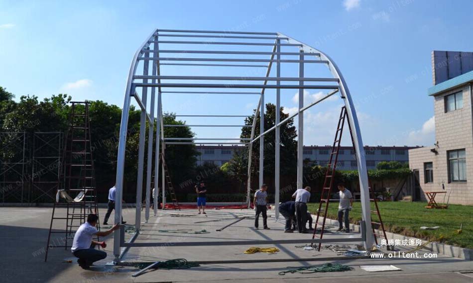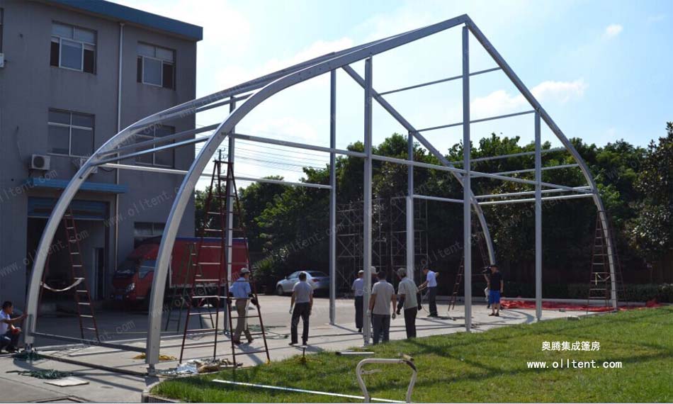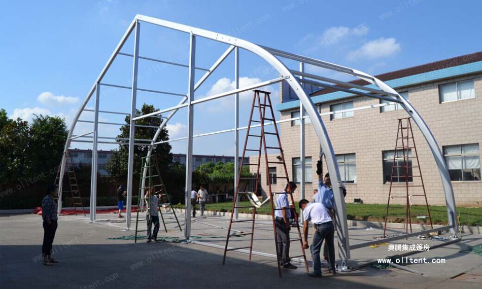 桃形篷房的結(jié)構(gòu)采用單元組合式設(shè)計(jì),長(zhǎng)度可按5米間距增長(zhǎng)或減小。支架材料采用高強(qiáng)度氧化鋁合金(材質(zhì)6061/T6),篷布為阻燃的雙面PVC合成纖維布,阻燃標(biāo)準(zhǔn)符合歐洲DIN4102 B1、M2標(biāo)準(zhǔn)。