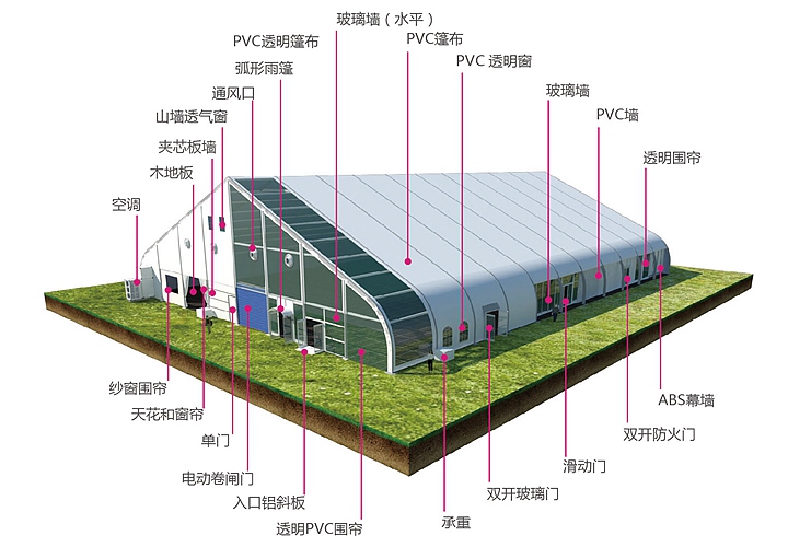 桃形篷房有多種可供選項(xiàng)購(gòu)的配置,其功能和用途更為強(qiáng)大。例如:ABS墻體、三明治墻體、彩鋼瓦墻體、玻璃幕墻、透明頂、頂幔布幔內(nèi)飾、排風(fēng)扇、卷簾門(mén)、玻璃門(mén)、承重盤(pán)承重框、地板系統(tǒng)、排水槽等