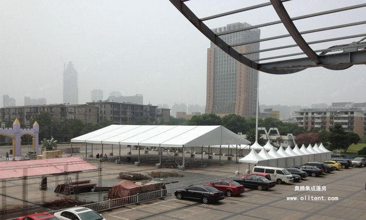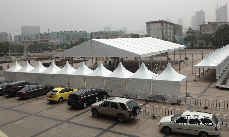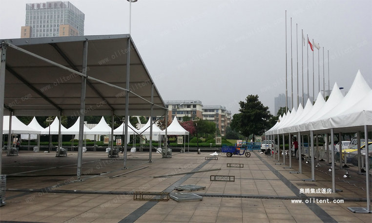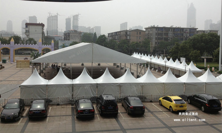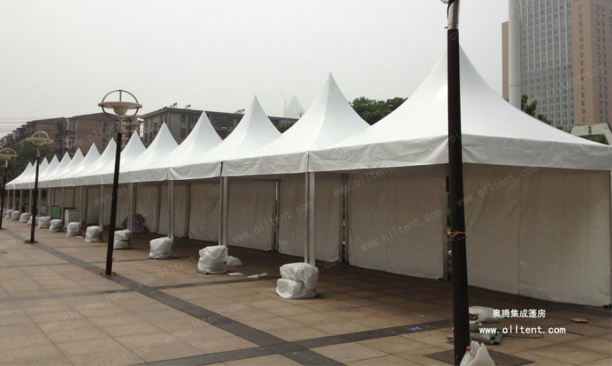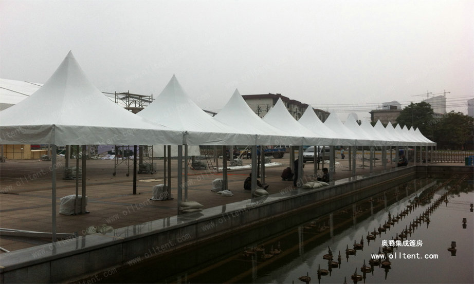尖頂篷房?jī)?yōu)雅,堅(jiān)固,潮流,搭建工期短,易于組裝和拆卸。新錐頂篷固定方式,已獲得設(shè)計(jì)專利證書,新的固定方式,不但大大減少了組裝時(shí)間,很好的防止滑出。無(wú)需大型機(jī)械協(xié)助,單個(gè)也可用排水槽連接起來組成更大的面積,形成特殊的造型。