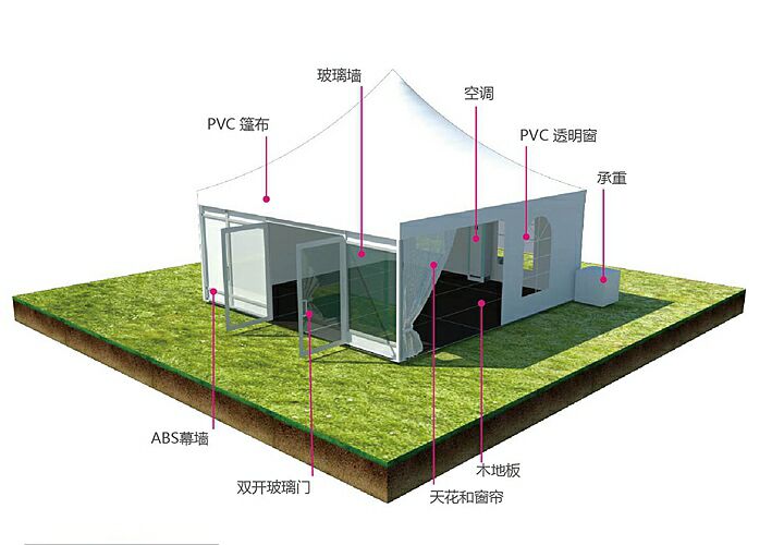 尖頂帳篷有多種可供選購(gòu)的配置,例如:玻璃墻體、玻璃門、木地板、地錨釘和天花內(nèi)飾等。錐頂帳篷除了用單獨(dú)使用外,還可以將它用排水槽連接起來組成更大的面積,形成獨(dú)特的造形,在戶外活動(dòng)應(yīng)用中更加精彩。