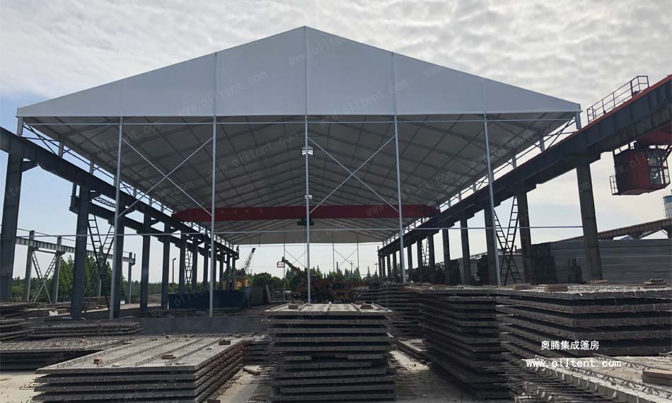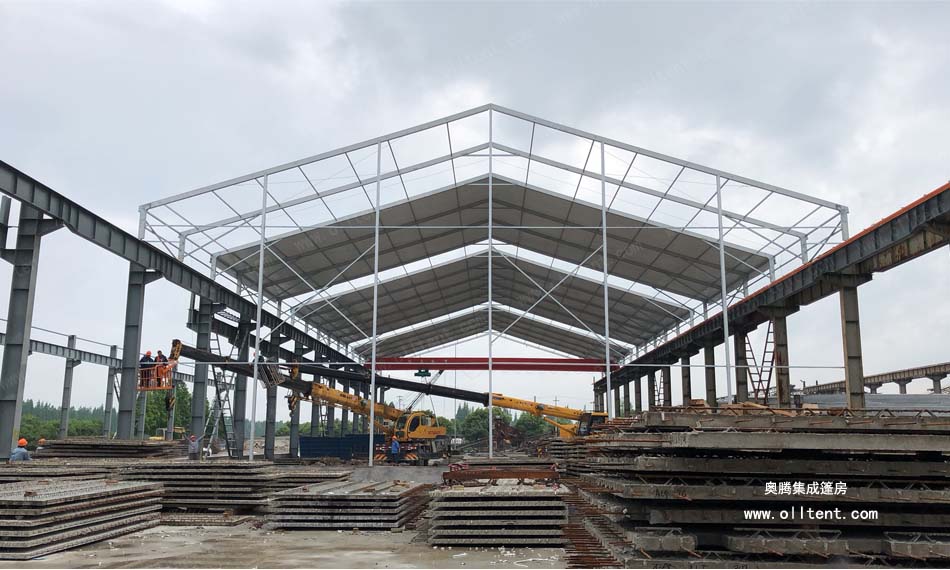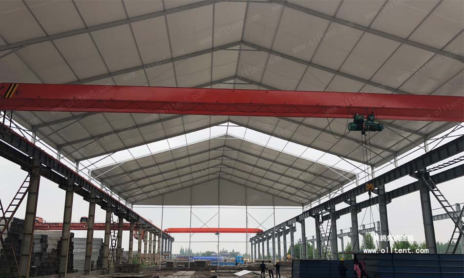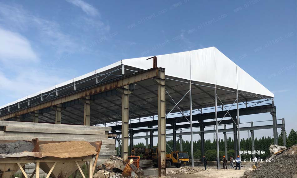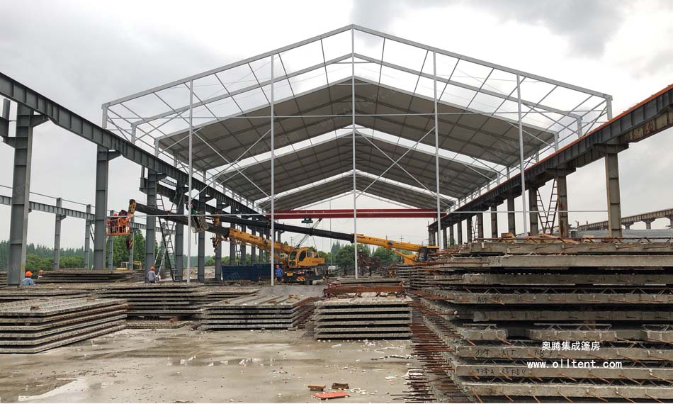 常熟賽順奇工業車間篷房搭建面積為4000平方米,施工時間是2018年3月,篷房規格為31米寬,130米長,邊高達到14米,搭建難度較高。篷房框架結構采用工字鋼和鋁合金型材相結合,篷布采用850g/m2PVC涂層布,兩面白色。篷房內部安裝行車,頂部開啟透氣窗,可以在篷房內部進行設備的裝卸作業。